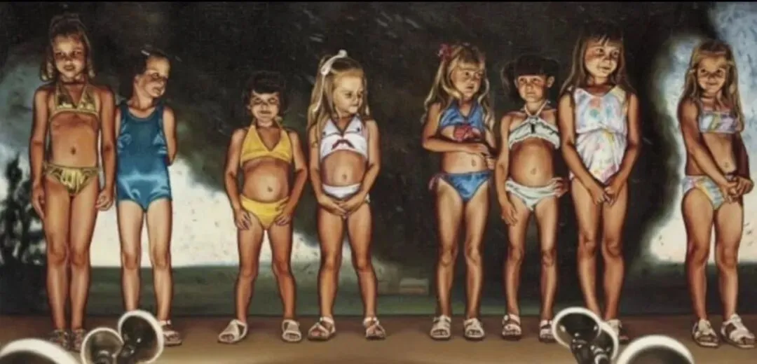 这幅画来自爱泼斯坦在纽约的住所。画中是舞台上的女孩们,她们似乎正在参加泳装比赛,接受评判。爱泼斯坦的受害者们描述说,她们在遭受他虐待时曾看到过这幅画。