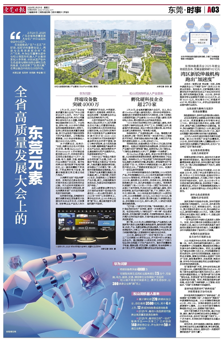 在这场推动广东“十五五”开好局、起好步的重要会议上,两张与东莞深度契合的“名片”闪亮,华为公司董事长梁华与松山湖国际机器人产业基地发起人李泽湘,分别从国产软件生态底座与硬科技创业孵化生态的角度,生动诠释了“东莞元素”在两业融合中的先行示范作用。