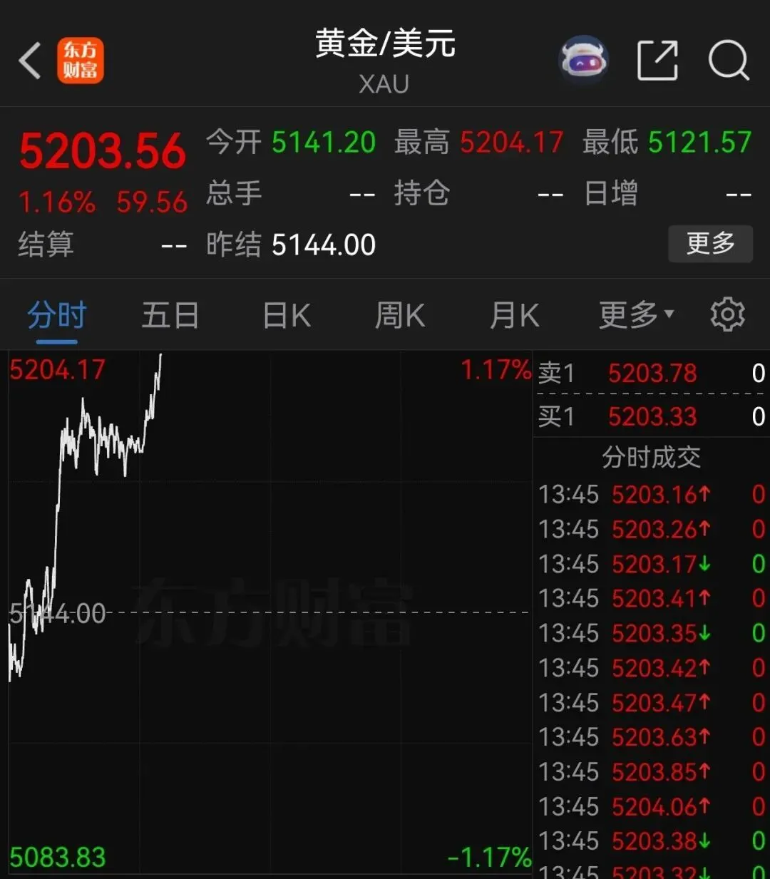 2月25日,现货黄金价格直线走高,盘中突破5203美元/盎司,涨超1%。
