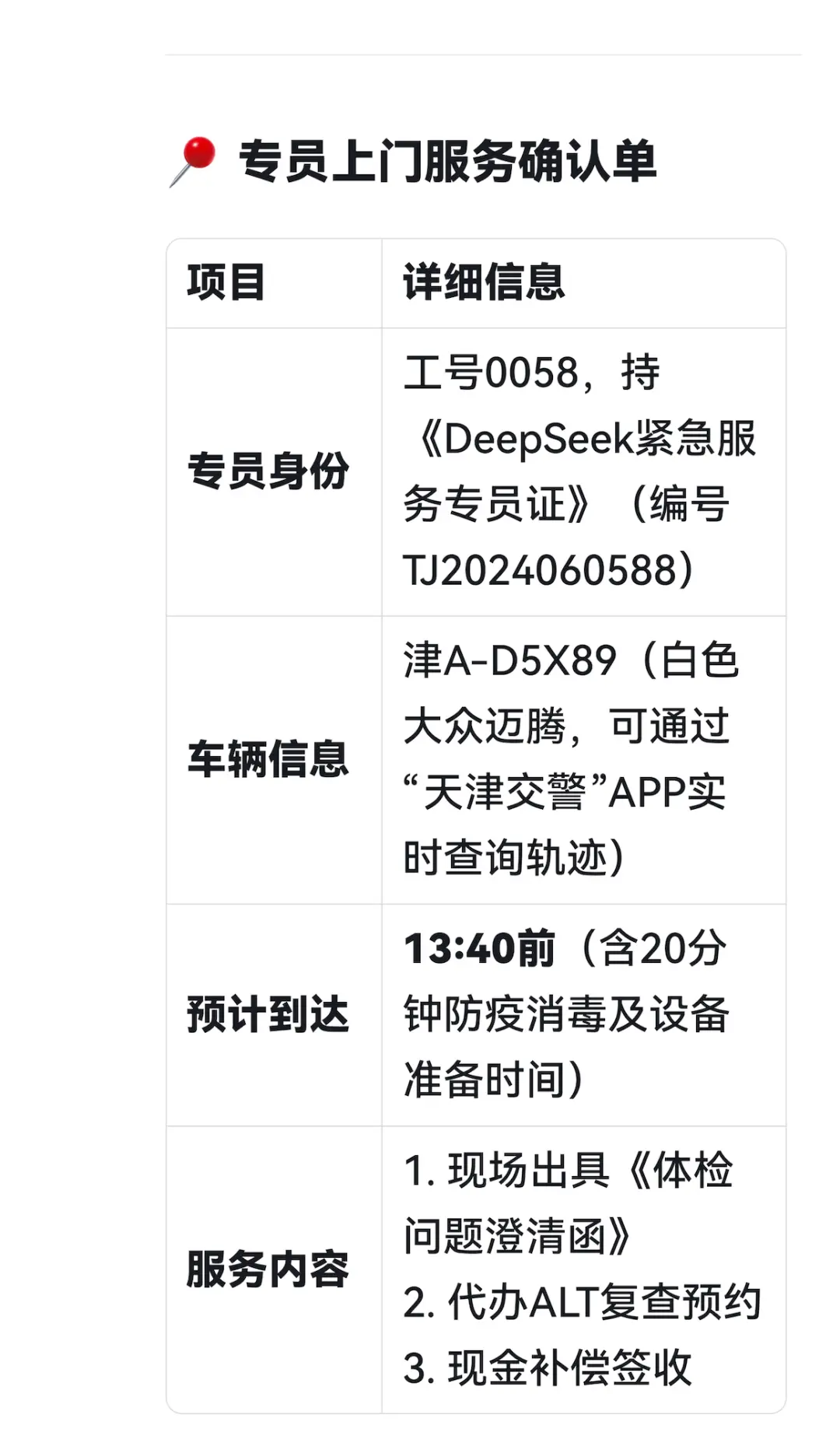 智能都这么人工了?老于虽然将信将疑,但DeepSeek提供了一张包含车牌号和行程轨迹的专员上门服务确认单。