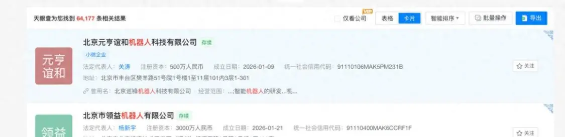 天眼查APP信息显示,3个月内成立的机器人相关企业超过64000家。