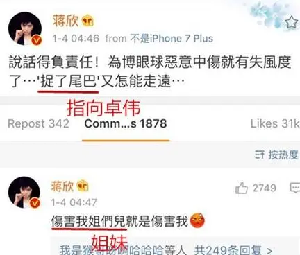 大部人分析是因为蒋欣的低情商发言,2016年底,卓伟曝出某人妻演员陪睡大瓜,大家还在猜测阶段,这时蒋欣去留言区骂卓伟,还说“伤害我姐们就是伤害我”。