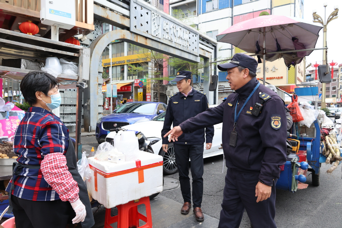 “您好,公共人行道属于禁摆区域,占道经营既影响行人通行,也存在安全隐患,请您配合将摊位转移至指定合规区域规范经营。”整治行动中,执法人员坚持“柔性执法与刚性管控”双轨并行,严格践行“宣传优先、处罚为辅”的执法原则,让城市管理既有力度又不失温度。执法人员对现场经营摊贩逐一开展普法教育,详细解读城市管理相关法律法规,引导经营者主动收拾摊位、规范撤离;对拒不配合的违规摊贩,依法进行劝导整改,对情节严重者采取暂扣经营工具等措施。同时针对商铺出店经营、长期占道堆放物品等行为,责令商户立即清理整改,并同步宣讲“门前三包”责任要求,引导商户自觉落实规范经营主体责任。