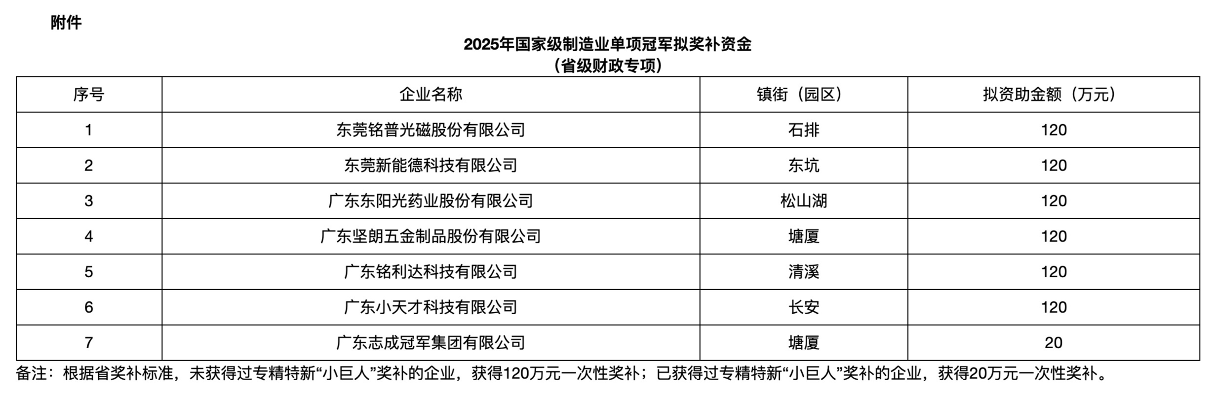 近日,东莞市工业和信息化局根据省级相关文件要求,正式公示了2025年国家级制造业单项冠军奖补资金(省级财政专项)拟资助项目名单。东莞铭普光磁股份有限公司等7家来自不同镇街(园区)的优质企业入选,拟资助总金额达740万元。