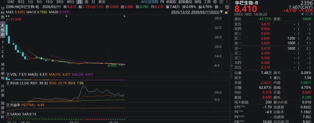 以华芢生物-B为例,该股去年12月才上市,上市以来跌跌不休,定价38.2港元,如今只有8.41港元,不足3个月暴跌78%,上演大型割韭菜戏码。