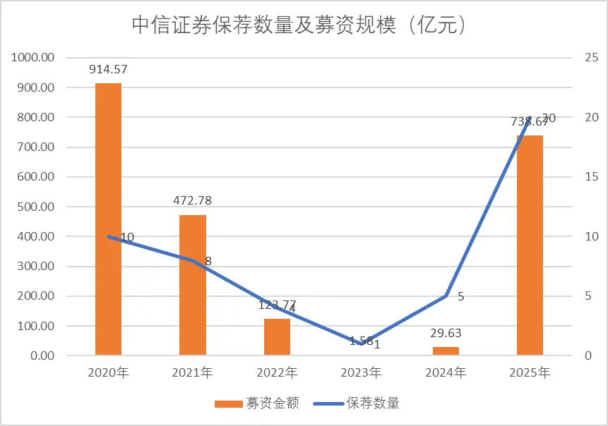 本次香港廉政公署突击检查两家中资券商,或和申报文件参差不全有关。据金石杂谈统计wind数据,以中信证券为例,2025年保荐20只新股,募资额规模739亿,创近5年新高,仅比港股大时代的2020年低些;25年相较于22-24年可谓天上地下,募资规模和数量突飞猛进。