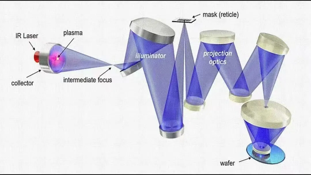 第一次轰击使用低强度的预脉冲撞击圆形锡滴使其膨胀,变成薄饼型。由于薄饼锡受光面积大,光强增大。然后第二次高强度的主脉冲以全功率撞击薄饼锡,锡原子被电离,产生高温、高密度的等离子体云,就在这团等离子体冷却衰变的极短瞬间,锡离子会释放出波长为13.5纳米的极紫外光子。收集镜捕获等离子体发出的EUV辐射(13.5nm),将其集中起来传递至曝光系统。