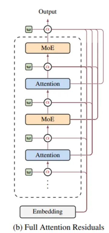 于是他们提出了一个“理想版”的方案,叫做全注意力残差(Full Attention Residuals)。