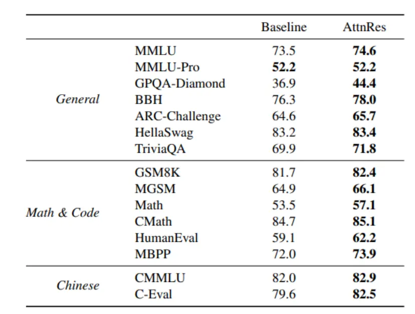 二是Kimi拿自己的大模型上做了实战验证。模型参数量为480亿,用超过一万亿个词的数据做了完整的预训练。然后在科学问答、数学推理、代码生成、综合知识等一系列主流测试中,加了块注意力残差的版本全面超过了没加的版本。