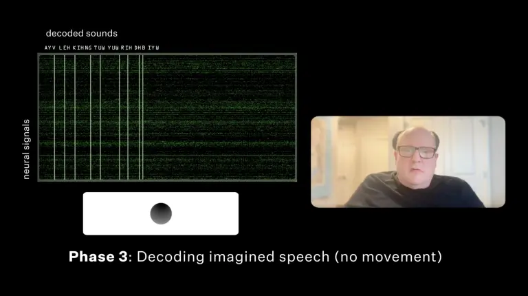 在第三阶段测试中,视频显示 Neuralink 软件在肖克完全没有嘴部动作的情况下,成功识别出他的语音。植入设备能将大脑信号对应至每个音素,再将其组合成单词,最终形成完整句子,由程序用肖克原本的声音朗读出来。