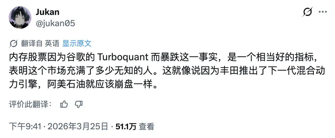在他看来,如果存储股因为一篇算法论文而大跌,恰恰暴露了市场里有多少人根本没搞清楚这件事的边界,并把这波反应比作「丰田出了新混动引擎,石油就该崩盘」。