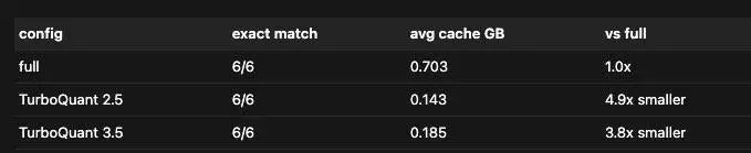 Apple Silicon MLX 框架的知名开发者 @Prince_Canuma 把算法移植到了 Apple Silicon 的 MLX 框架,测试 Qwen3.5-35B 模型,上下文长度从 8500 到 64000 token 全覆盖,每个量化等级都跑出了 100% 的精确匹配。他还发现,2.5 位的 TurboQuant 能把 KV Cache 压缩近 5 倍,准确率零损失。