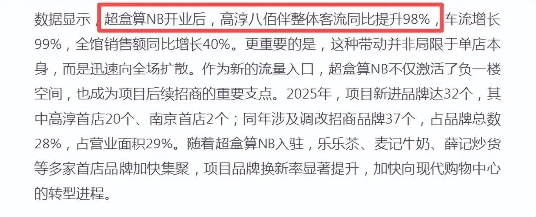 南京高淳八佰伴B1层,盒马超盒算NB开业首月日均客流2万,带动全馆客流激增98%,销售也随之大增。
