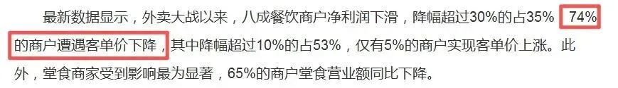 加上外卖平台的佣金就要20%左右,叠加食材、人工成本上涨,74%的门店客单价都在下跌。