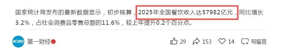 其次是外卖分流。外卖崛起后,堂食客流被其抢走;2025年全国餐饮收入5.8万亿元,其中外卖市场规模近2万亿元,占餐饮总营收近30%。