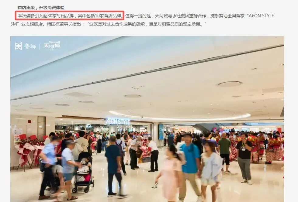 2025年广州天河城改造B1层,引入了34家新品牌、10家首店;主打潮流零售与休闲餐饮两大业态,客流同比提升超20%,整体坪效明显升高。