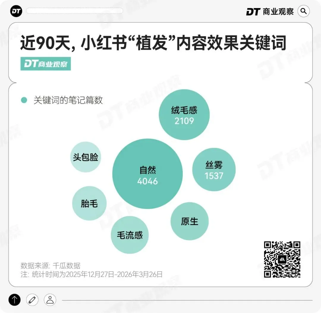 近3个月小红书植发相关内容中,“自然”“绒毛感”“丝雾”“原生”等词高频出现,而“遮秃”一词并没有被提及。