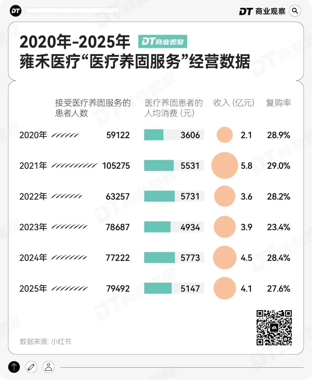 2025年,雍禾医疗的医疗养固业务消费人数为7.9万,虽然超过了植发消费人数的7.1万,但同比2024年只增加了约2000人,远低于同期植发新增的1万人。