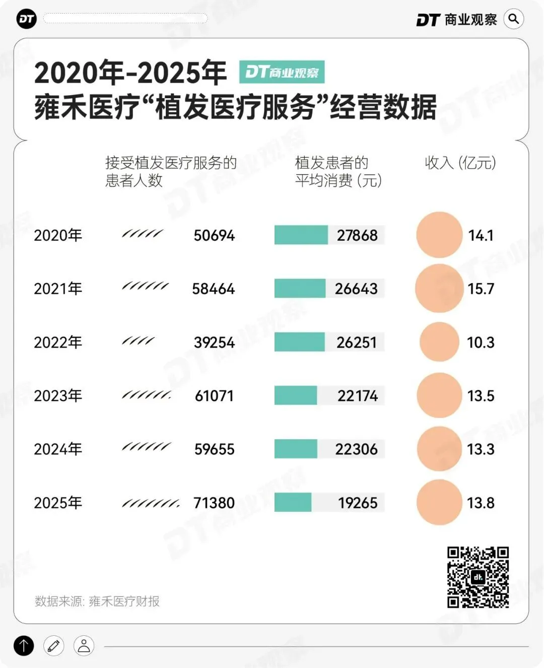 2025年,雍禾全年植发人数7.14万人,同比增长19.65%,但全年植发业务收入为13.75亿元,同比增长仅3.34%,背后是平均客单价同比下滑13.63%。