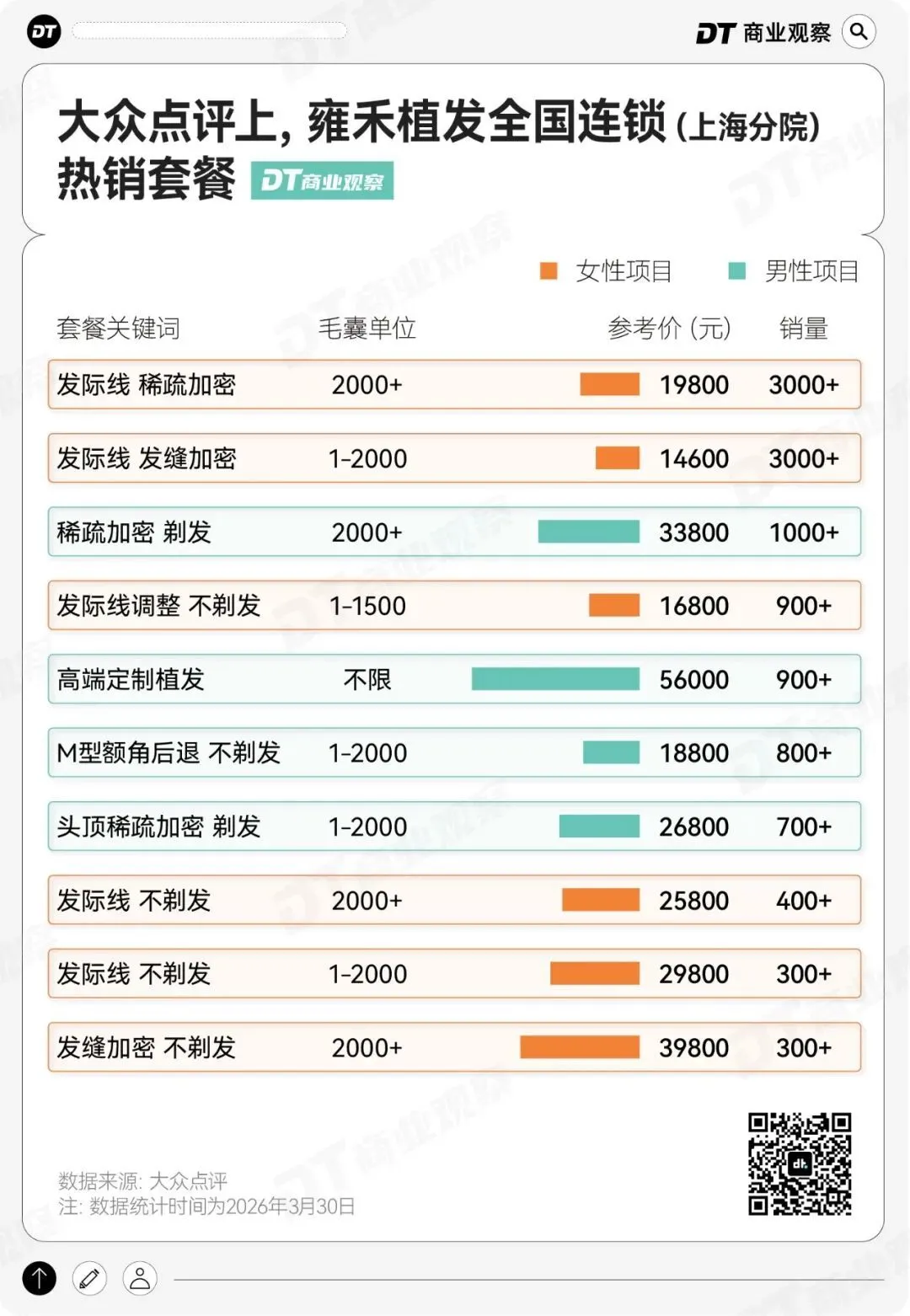 以2026年3月大众点评雍禾植发上海分院的数据为参考,目前店内销量TOP2套餐,均为针对女性的发际线植发项目,而且套餐价格都在2万元以内,低于同等毛囊单位下的男性植发套餐价格。(具体成交价格或有浮动,该价格可作市场参考)