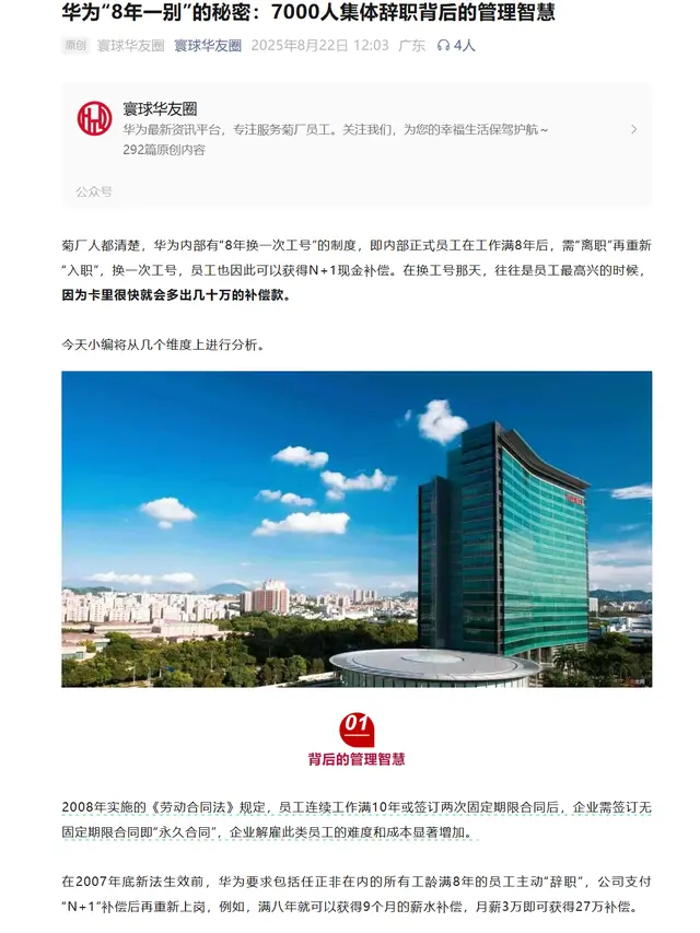 传华为取消主动离职N+1补偿,满8年续签员工仍需换工号
