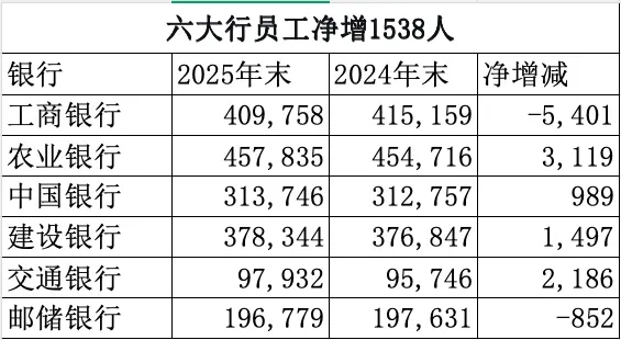 让人颇感意外的是,虽然六大行的银行网点在持续减少,但员工总数却净增加了1538人,而且已经连续三年净增长,这无疑和“年轻人逃离银行”的说法大相径庭。据年报显示,截止2025年末,六大行员工人数合计185.44万人,同比净增1538人。