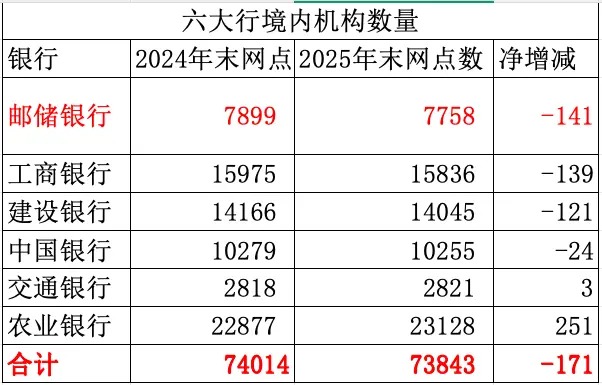 其中,邮储银行净减少209家,由39224家降至39015家,是六大行中减少最多的一家。不过,需要说明的是,邮储银行的网点总数量和减少数量均包含其特有的代理网点。若仅以其自营机构统计,则减少了141家,由7899家降至7758家。