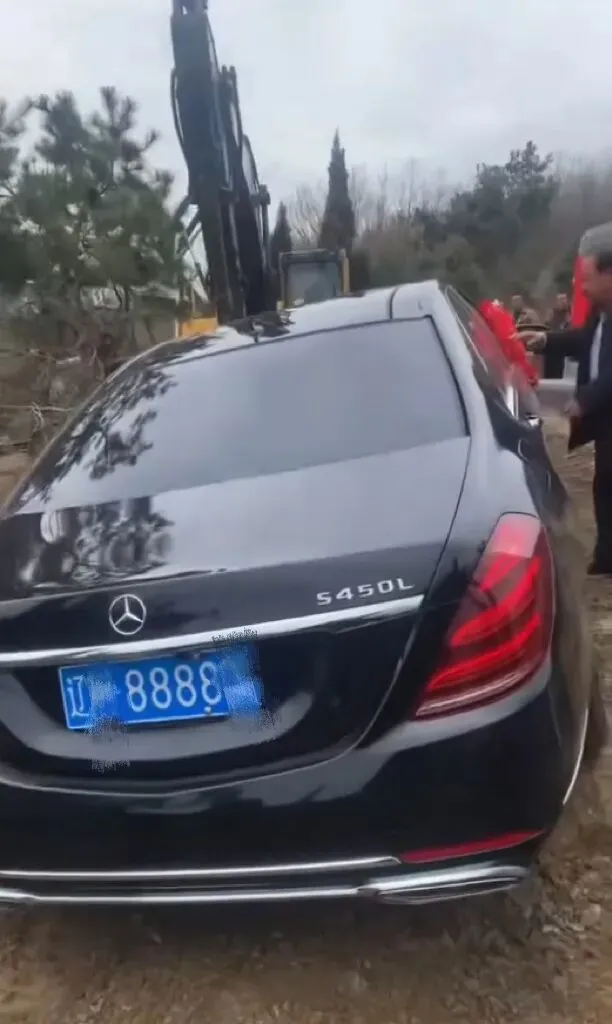 多条视频显示,多名人员在一座墓碑附近,用挖机挖出巨大的土坑,再用挖机将一辆挂有“辽*8888*”牌照的黑色奔驰S450L吊起,缓慢放入坑中,然后用挖机将土填平,将奔驰车掩埋其中。