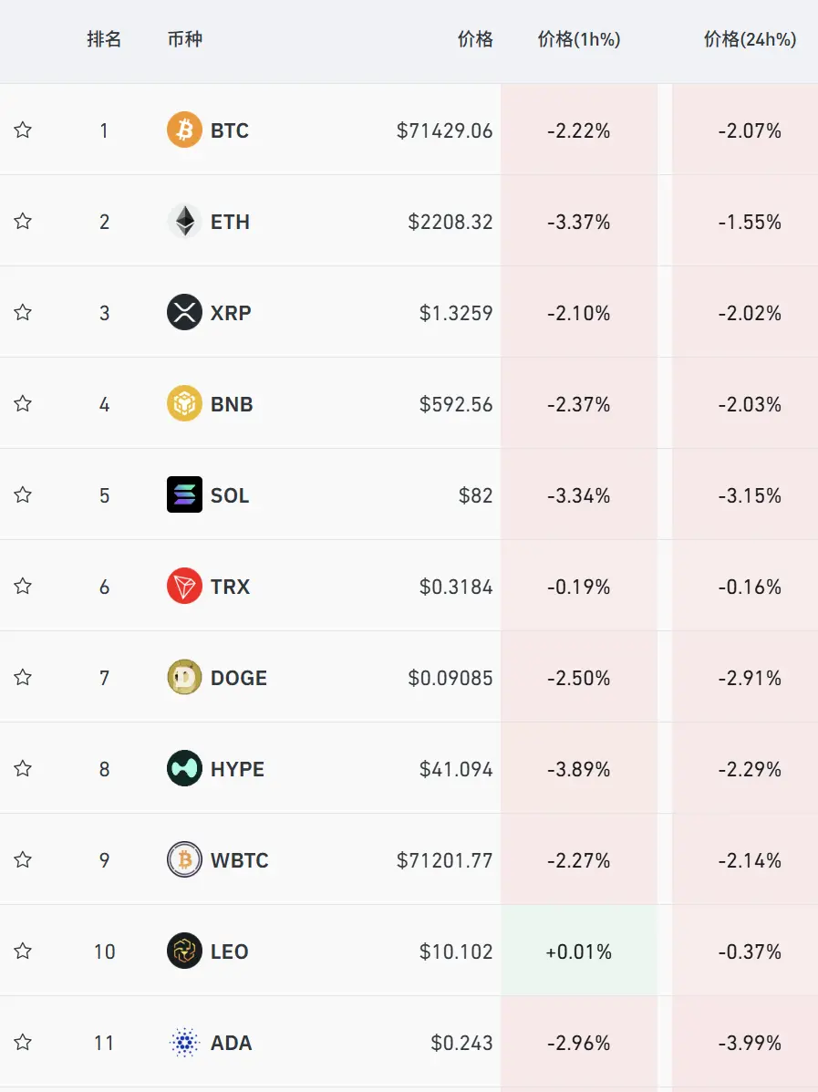 加密货币市场集体走低,ETH跌至2200美元附近,XRP、SOL、DOGE等主流币种均有明显跌幅。