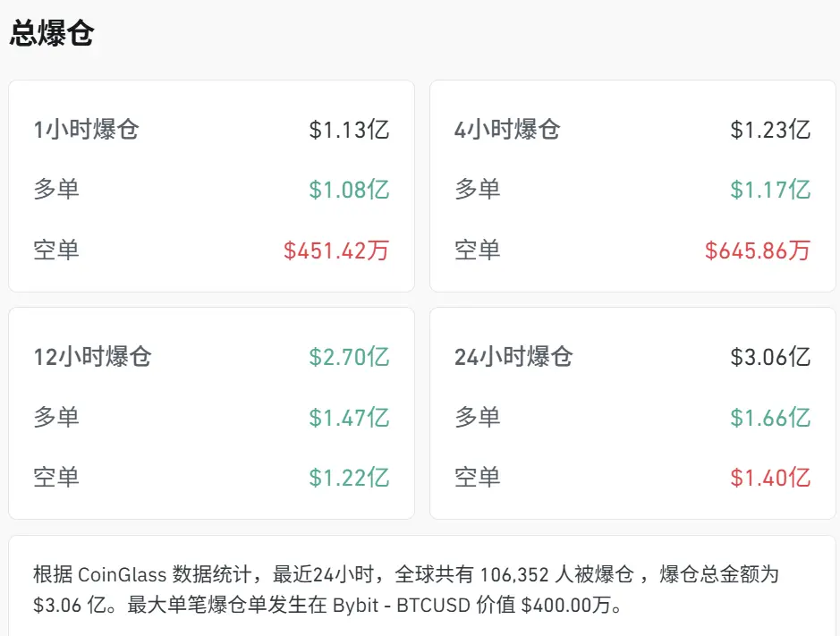 根据CoinGlass数据统计,最近24小时,全球共有106,360人被爆仓,爆仓总金额为3.06亿美元。其中多单1.66亿美元,空单1.4亿美元。