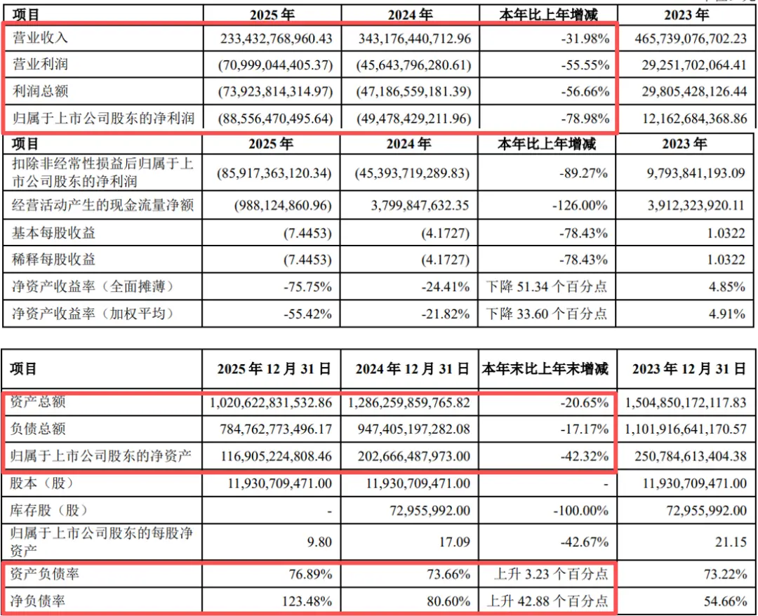 年报数据显示,2025年万科实现营业收入2334.3亿元,同比大幅下降32%;实现归属于上市公司股东的净亏损885.6亿元,同比扩大79%。