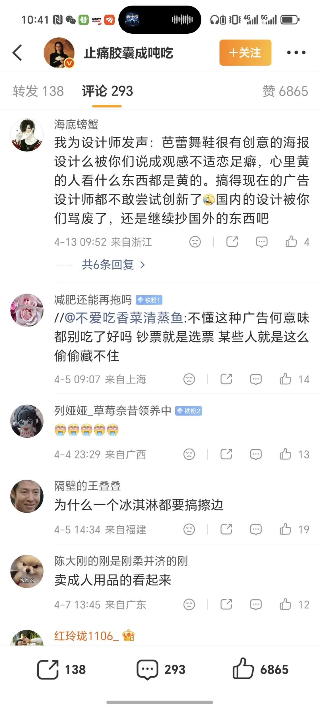 “我为设计师发声:芭蕾舞鞋很有创意的海报设计么被你们说成观感不适恋足癖,心里黄的人看什么东西都是黄的。搞得现在的广告设计师都不敢尝试创新了,国内的设计被你们骂废了,还是继续抄国外的东西吧。”
