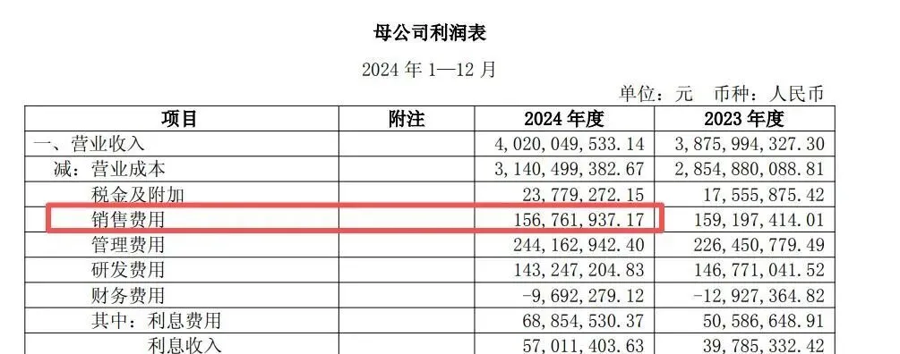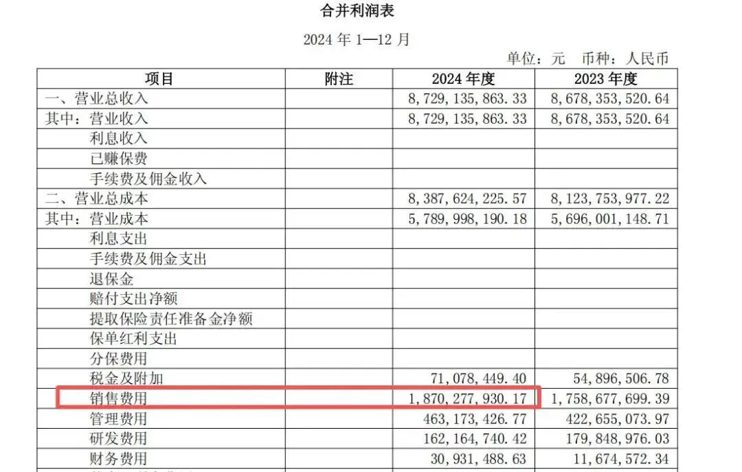 2024年,其母公司销售费用仅1.57亿元,而合并销售费用高达18.7亿元;近90%的销售费用都下沉到各家子公司。