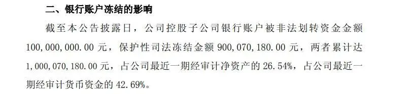 加上被划转的1亿元,涉案及冻结的资金达10亿元,占公司最近一期经审计净资产的26.54%,占货币资金的42.69%。