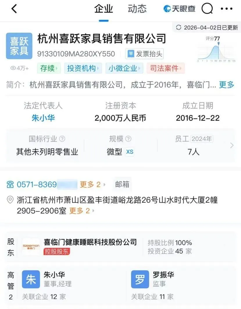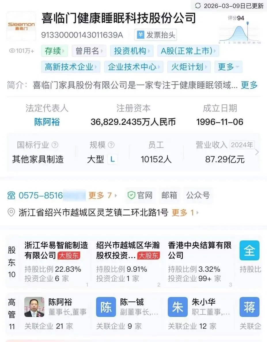 其法定代表人、董事、经理均由喜临门副总裁朱小华兼任;他还是上市公司的职工董事,身兼上市公司高管、子公司法人、子公司经理数职。