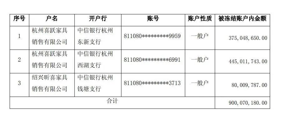 让人难懂的是,在事件曝光后,喜临门紧急对旗下杭州喜悦等子公司的多个银行账户采取保护性冻结,涉及金额高达9亿元。