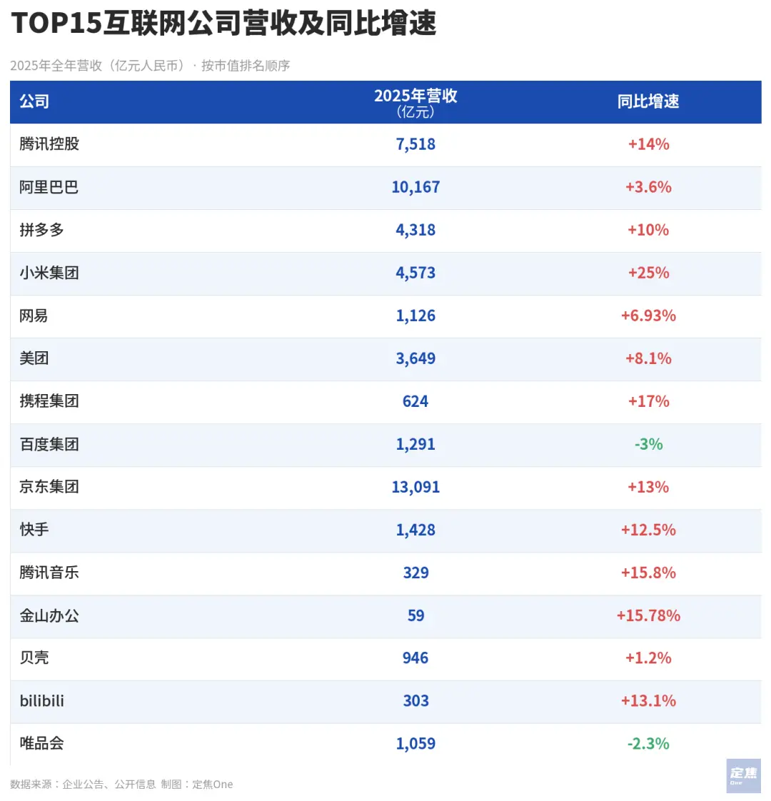 以市值划分,腾讯和阿里在2025年坐稳了头部互联网大厂的位置,而这两家的财报在过去一年也代表了互联网行业的两个极端。