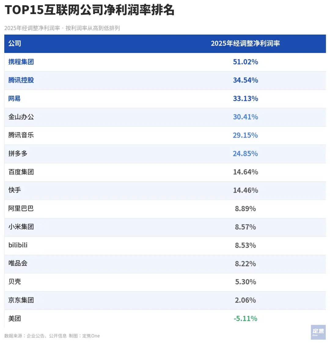 携程、百度、京东、快手、腾讯音乐在2025年末市值并未拉开明显差距,一起处于第二梯队中游水平。
