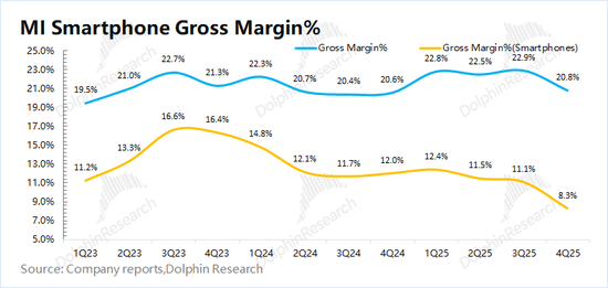 2025年的财报显示,小米手机毛利率已下滑至10.9%,其中,四季度的毛利率只有8.35%。高盛在此前的研报中预测,2026年小米手机业务将亏损约41亿元,手机毛利率将下滑至8%。