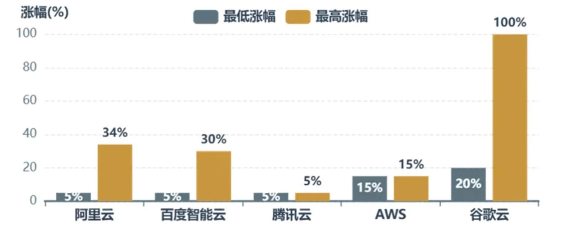 在云端,3月到4月间,国内头部云厂商接连调价,打破了行业长期低价竞争惯性。阿里云4月18日起AI算力产品最高涨幅34%,高性能存储涨幅30%;百度智能云AI算力产品上调5%-30%;腾讯云5月9日起AI算力等产品上调5%。全球范围内,亚马逊AWS已于1月对机器学习实例上调价格约15%,谷歌云也进行小幅调整。