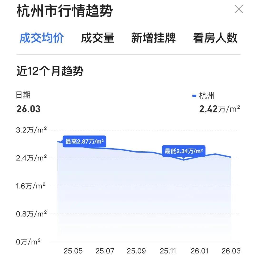 杭州二手房成交整体均价于2025年4月份跌破3万元,目前已经跌至2.42万元/平方米。