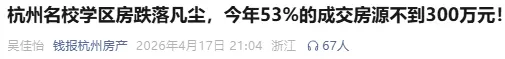 杭州本地媒体钱江晚报旗下的“钱报杭州房产”4月17日发了一篇文章《杭州名校学区房跌落凡尘,今年53%的成交房源不到300万元!》。