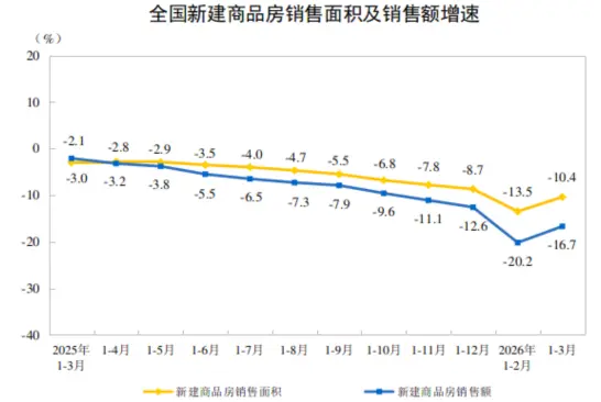 1-3月份,新建商品房销售面积19525万平方米,同比下降10.4%;其中住宅销售面积下降13.1%。新建商品房销售额17262亿元,下降16.7%,降幅收窄3.5个百分点;其中住宅销售额下降18.5%。