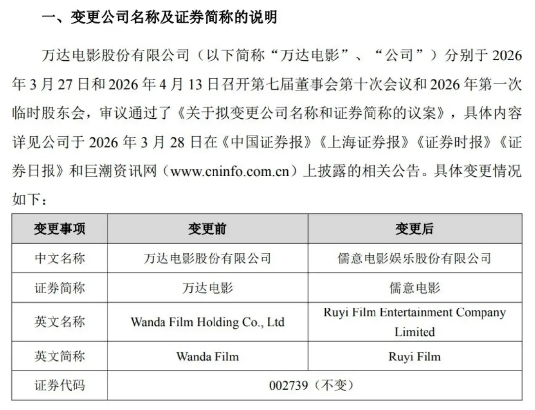 万达电影和万达商管,一度都是万达集团旗下的公司。2026年4月19日,万达电影发布公告称,公司已完成工商变更登记手续,公司名称由“万达电影股份有限公司”变更为“儒意电影娱乐股份有限公司”,证券简称由“万达电影”变更为“儒意电影”,证券代码002739保持不变。