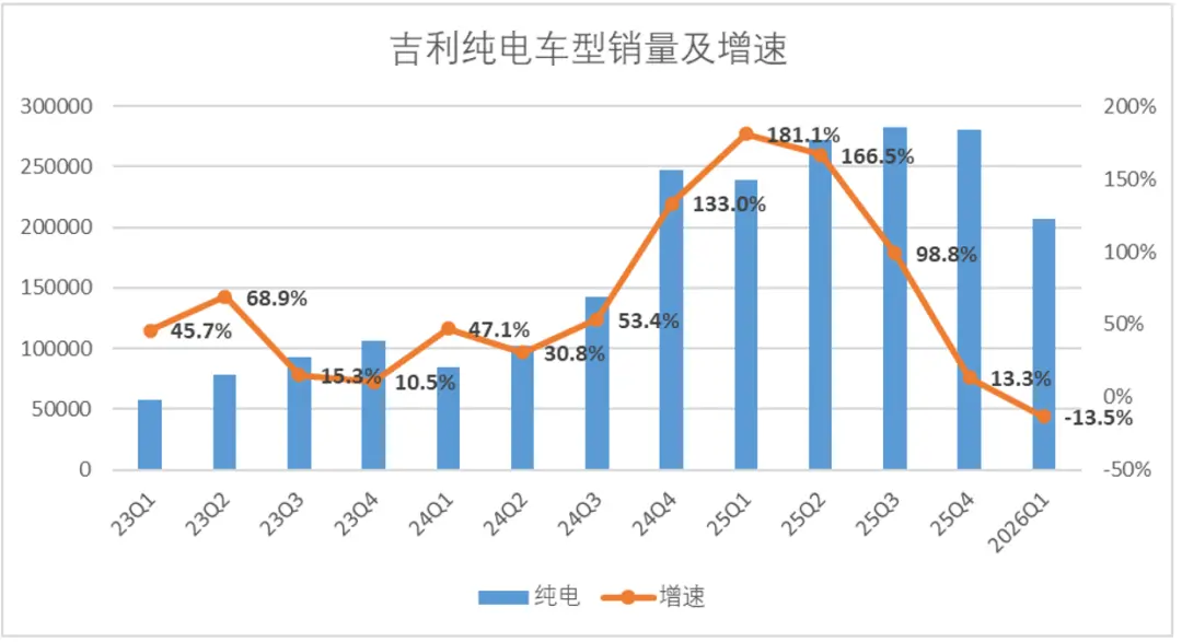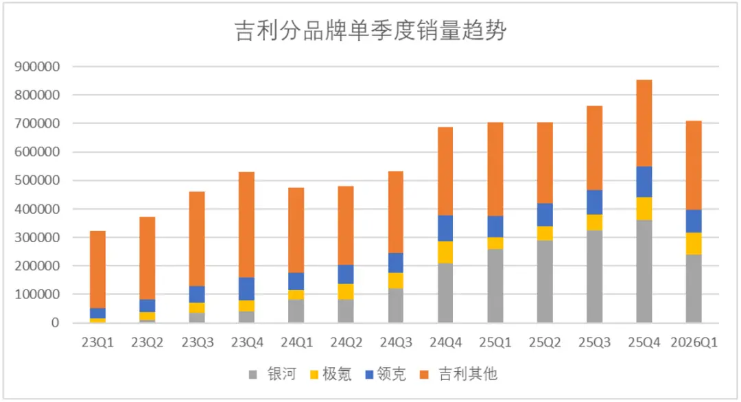 当然价格敏感车型在补贴退坡后影响相对明显,2026年第一季度银河增速回落至33%区间,不过横向对比市场其他品牌来看,银河车型的价格还是很有竞争力,即便增速回落,也能保持至少单季度内的正增长。作为吉利主打冲量的品牌,毫无疑问的是银河完成了阶段性的任务。