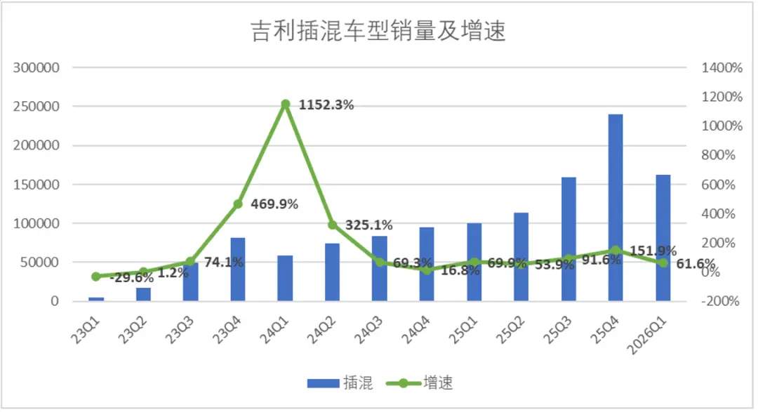 而相对于纯电而言,吉利插混车型明显更加稳定,自2025年第一季度至今,吉利插混车型的增速从未低于50%,即便是补贴退坡的2026年Q1,吉利纯电车型出现了小幅度负增长,但是插混车型依然维持了60%以上的增速,撑起了吉利新能源基本盘。所以说横向对比来看,插混车型对补贴的依赖程度相对较低。