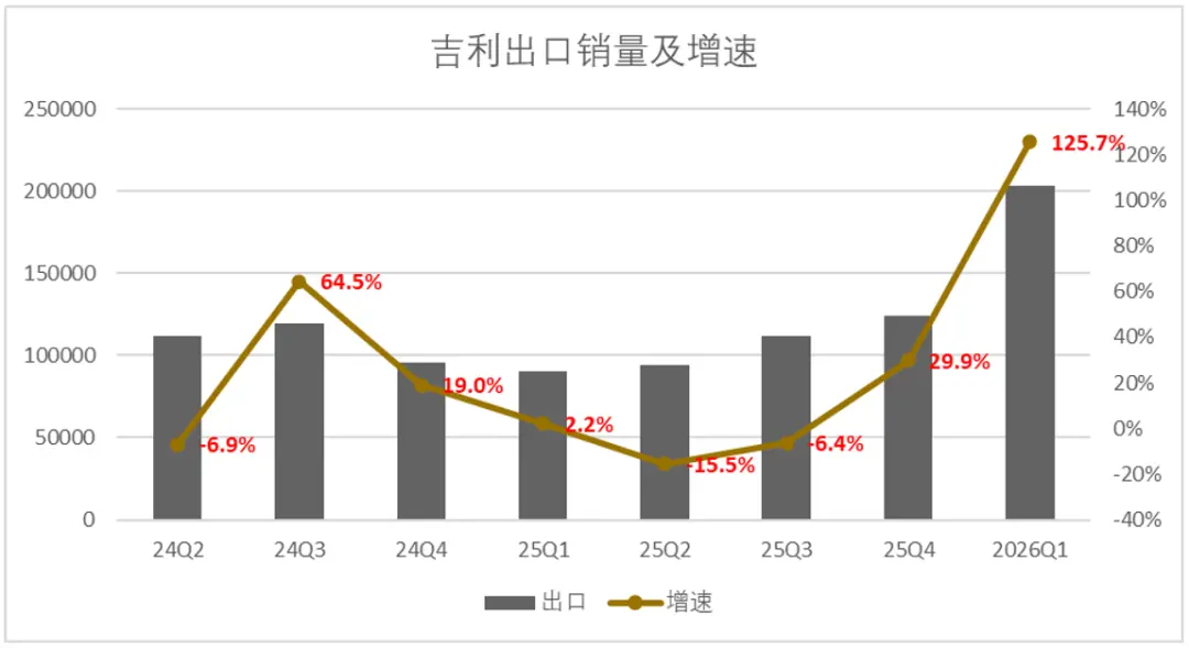 不过我们也能看到管理层重塑海外渠道的决心,随着海外渠道网络重新构建,领克改回经销制一年有余, 2026年开年吉利的出海数据还算不错,一季度整体增速来到了126%,有明显回暖的趋势。