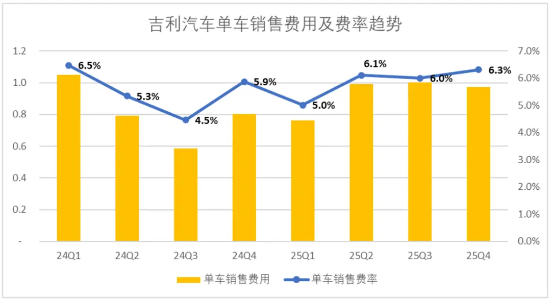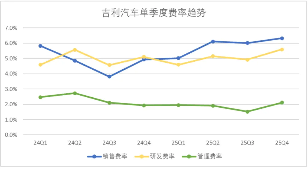 再来看一下吉利的费用表现,2025年吉利整体的费控表现相对一般,尤其是第四季度,费率出现了明显的抬头。第四季度销售费用、管理费用、研发费用分别录得67亿、22亿及59亿元,三项费率分别为6.3%、2.1%及5.6%。