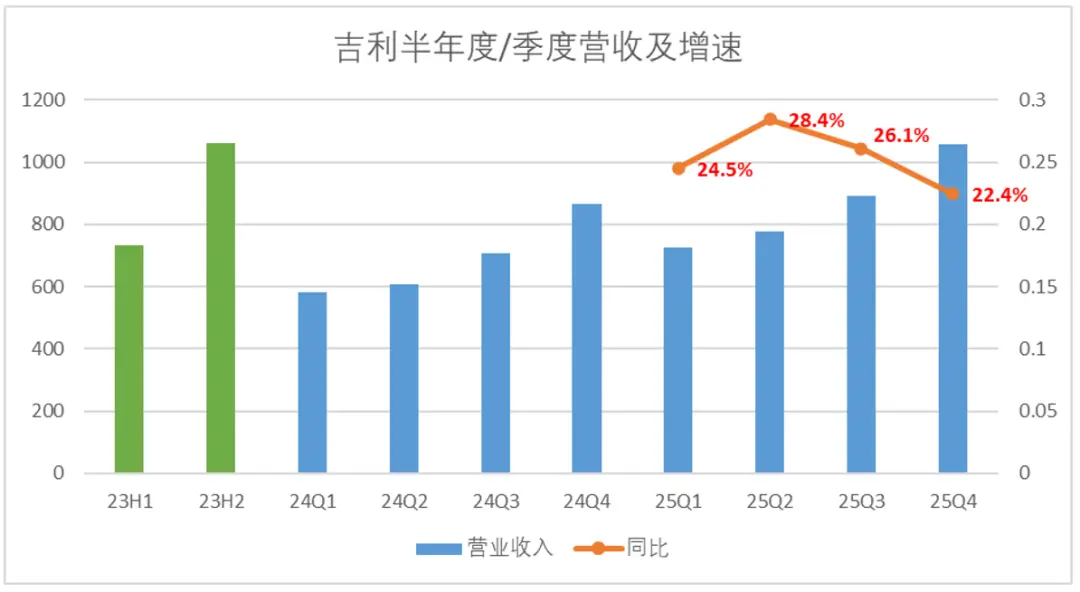 2025年吉利录得全年营收3452亿元,创历史新高,其中四季度录得1058亿元,同比增速达到了22.4%,为上市以来首次单季度营收破千亿元,仅从营收侧的表现来看,吉利2025年的答卷堪称完美。
