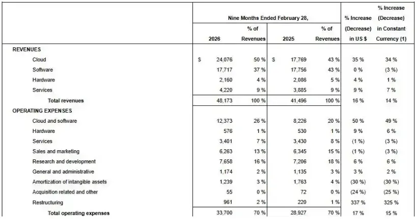 2026财年第三财季,甲骨文云业务实现销售收入89亿美元,同比增长44%,收入占比达到52%。其中,云基础设施(IaaS)实现销售收入49亿美元,同比增长84%,成为云业务营收快速增长的关键;SaaS业务实现销售收入40亿美元,同比增长13%。